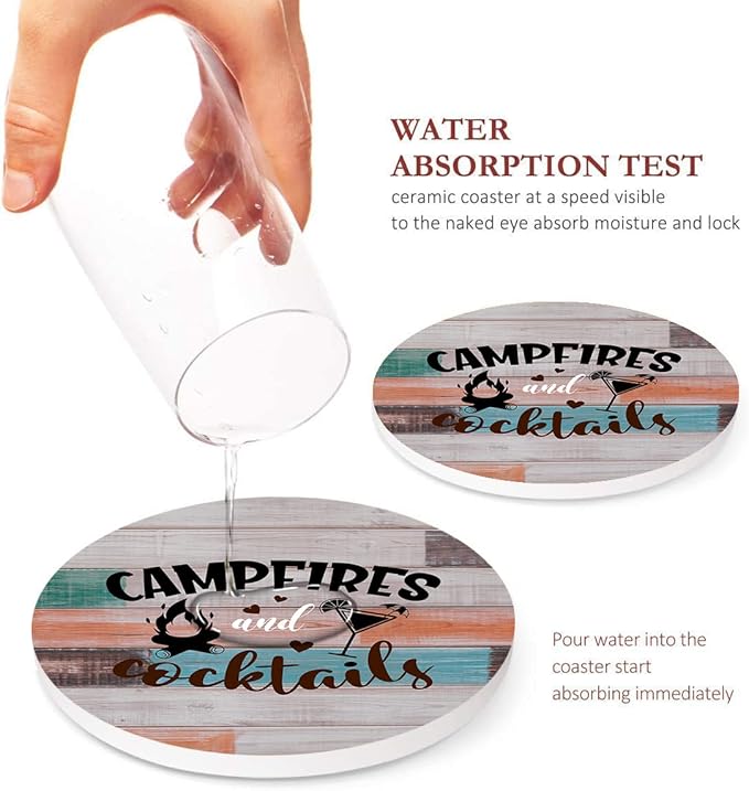Britimes Coaster for Drinks Set of 6, Wooden Summer Camping Forest Absorbent Round Ceramic Stone Mat, with Cork Base and Metal Holder, Gift for Housewarming Room Bar Decor