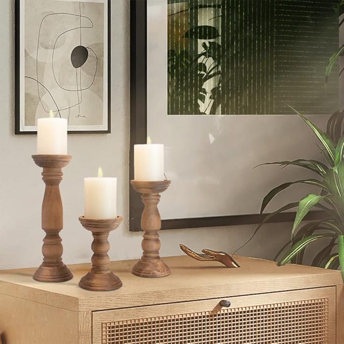 - Dimensions: S:12”×4”M:9”×4” L:6”× 4”. wooden candlesticks are perfectly proportioned, featuring varying heights that create an aesthetically pleasing set. They are perfect wood centerpieces for tables, as well as decorative pieces for fireplace mantel decor, coffee table decor, dining table decor.