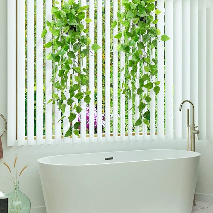 - Package Includes: 2 Pack artificial hanging plant with black pot. the trailing foliage vine extending up to 39.37"(100cm), Its compact dimensions enable effortless, versatile placement in any space, This artificial pothos plant looks very lush.