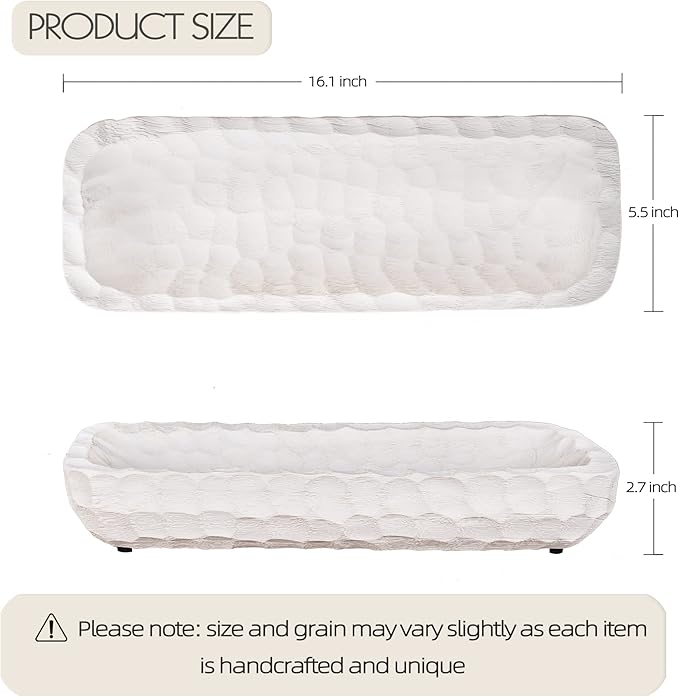 Decorative Bowl for Home Decor, Long Dough Bowl with Hand Carved Irregular Texture, Unique Table Centerpieces, Wooden Home Decor Accents for Farmhouse Boho Rustic Style(16.1"x 5.5" Washed White)