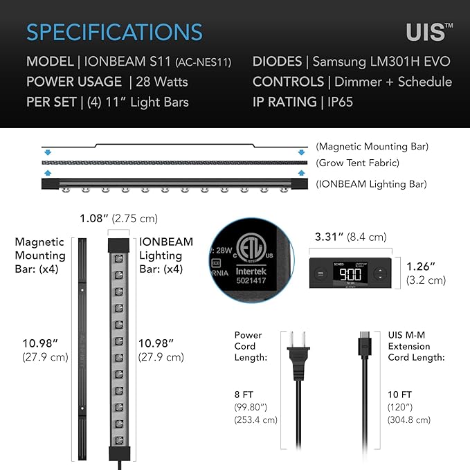 AC Infinity IONBEAM S11, Full Spectrum LED Grow Light Bars 11”, Deeper Penetration Samsung LM301H EVO Diodes and Digital Dimming Timer Controller, for Veg Bloom Indoor Plants, Grow Tents, Greenhouses