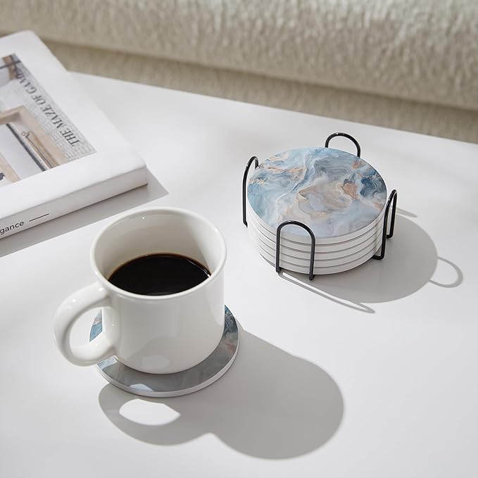 Set of 6 Abstract Blue Marble Coasters with Holder, Absorbent Ceramic Coasters for Drinks, Coasters with Cork Backing for Table Protection, Housewarming Gifts for New Home