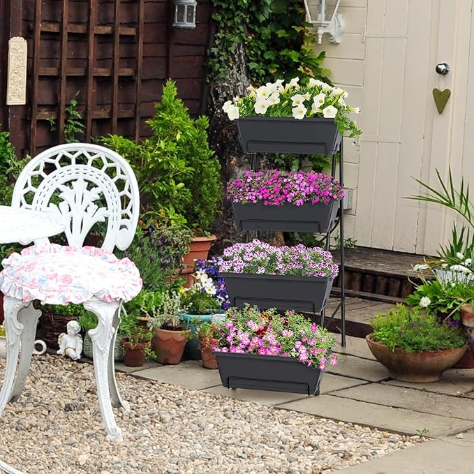 - 【4 Tier Vertical Raised Garden Bed】: Vertical garden planter size: 16.8*18.3*41.5 inches. Planter box size: 16.8*7.02*5.5 inches. The compact size enables our raised planter box to fit well in your patio balcony, deck, or backyard. The vertical design with suitable height will not restrict the growth of the lower level plants and keep away from the constant bending plantation work.