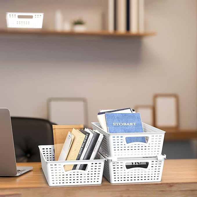 Simple Houseware Plastic Stackable Storage Basket Pantry Organizer, 6 Pack, 14.5" x 8.5" x 3.5", White
