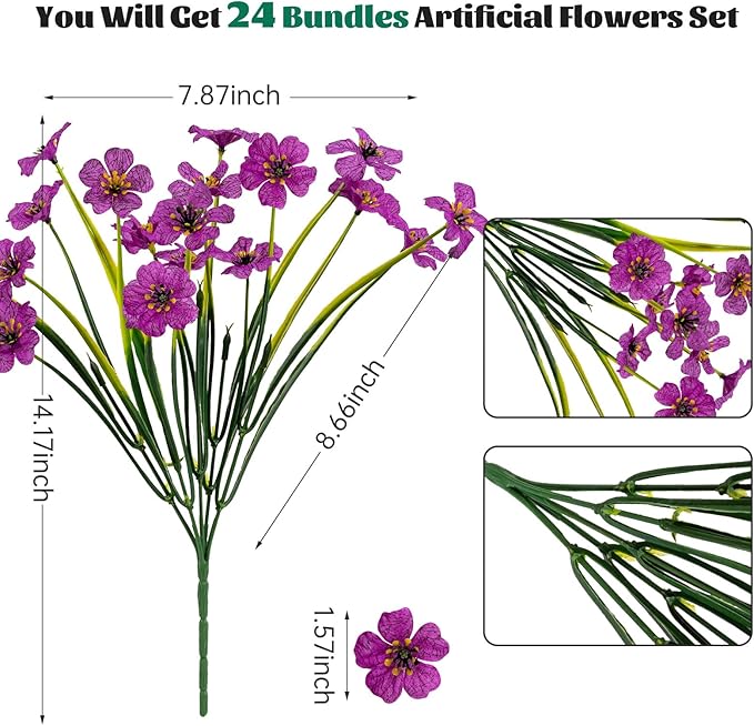 - 【High Quality&UV Resistant】:In order to extend life and maintain a fresh appearance for the best decoration, these artificial flowers are made of high-quality plastic that is resistant to uv,24PCS each plastic flowers have 5 flexible stems.