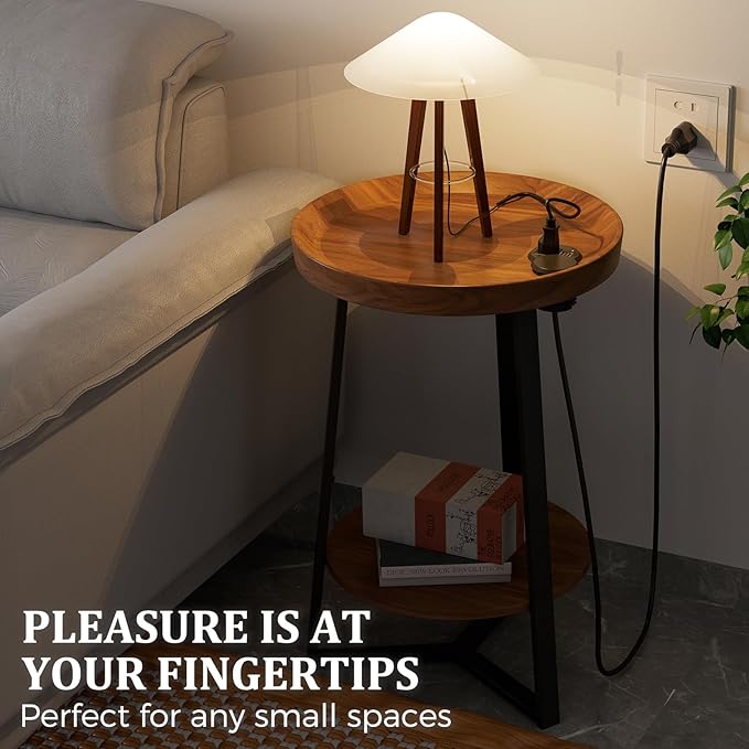 Gadroad Round End Table with Charging Station, USB Ports, Wood Tabletop & Black Metal Frame, 2-Tier Side Table for Living Room, Bedroom, Brown 15.7 * 15.7 * 23.0inches