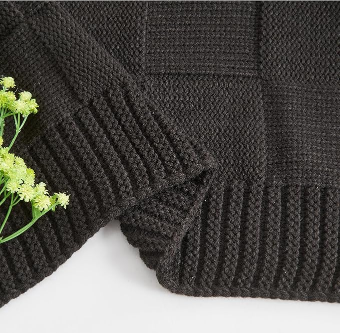 - DESIGN & STYLISH:The checks knitted pattern integrated with seed-stitch knit looks more classic and cute.This unique design gives the throw blanket a homespun look that's relaxed and inviting.This knit design is equally soft and chic, keeping you warm in style. This jet black throw blanket will look amazing draped over any couch or over the end of a bed to provide that sumptuous cozy look