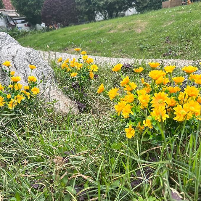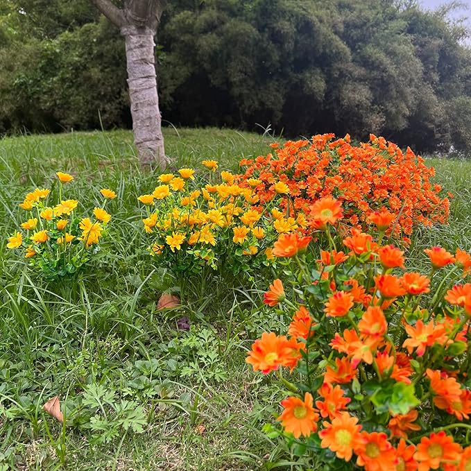 alyptus Fake Mums Outdoor Yellow Flowers 8 Bundles Plants for Outside Fall Artificial Flower UV Resistant for Wedding Home Garden Window Box Decor