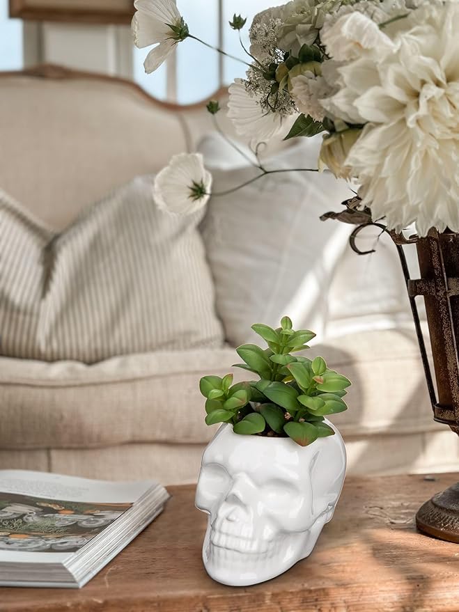 - [Small Artificial Succulents] -White succulent pot size is approx 3x3.9x3.3 inches, and set of 2 fake desk plant height approx 6.3 inches. Lifelike mini artificial plants potted in Gothic Themed Skull ceramic pots, covered with stones, whether indoor or outdoor fake succulent plant looks so real and unique.