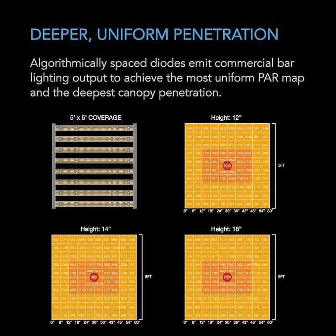 - Bar-style fixture with algorithmically spaced diodes optimized for even coverage, deep canopy penetration, and hotspot reduction.