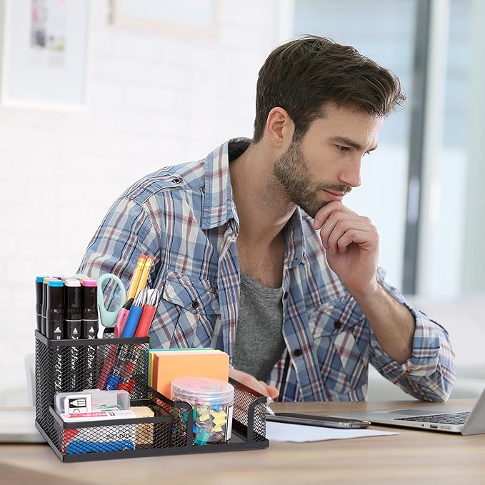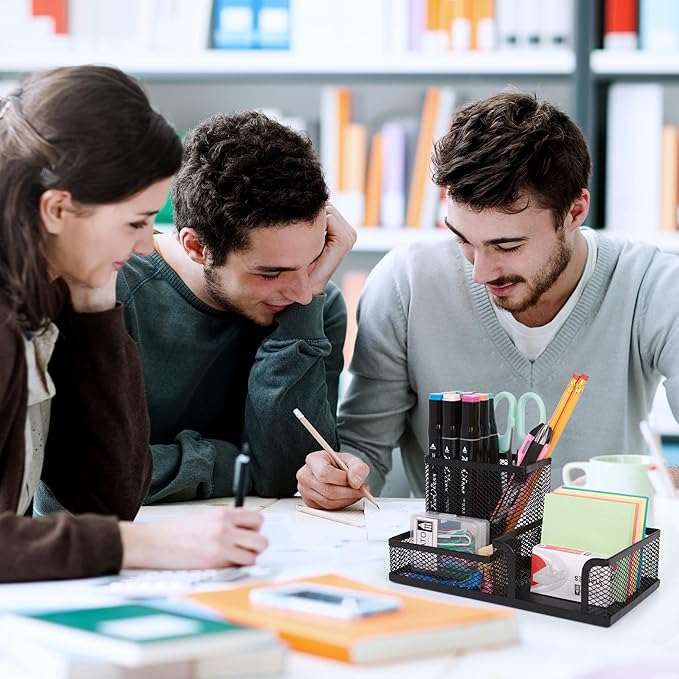 - Space Saving:3 Compartments Black Mesh Pencil Holder organizer compartments let you separate pens,scissors,rulers,glue sticks and binder clips, sticky notes and sticker dots, tacks.