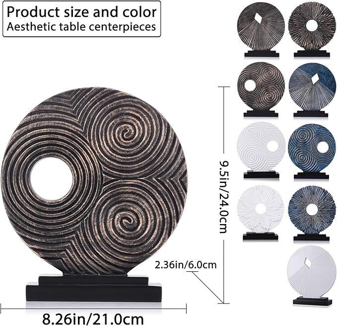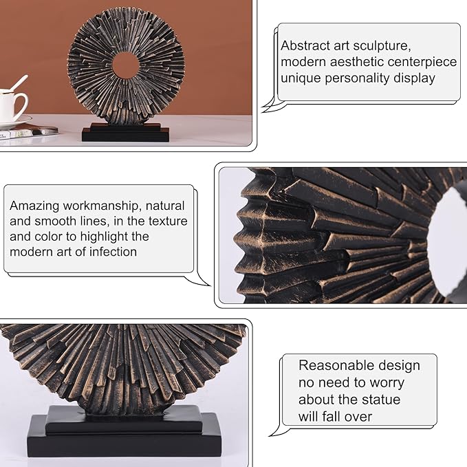 - Contemporary Round Sculpture: Elevate your home decor with this exquisite round sculpture, a perfect centerpiece for any room. Crafted with meticulous attention to detail, this black and gold statue exudes elegance and adds a touch of sophistication to your living room, bedroom, coffee table, entrance, kitchen, bathroom, mantelpiece, and above cabinet decor.