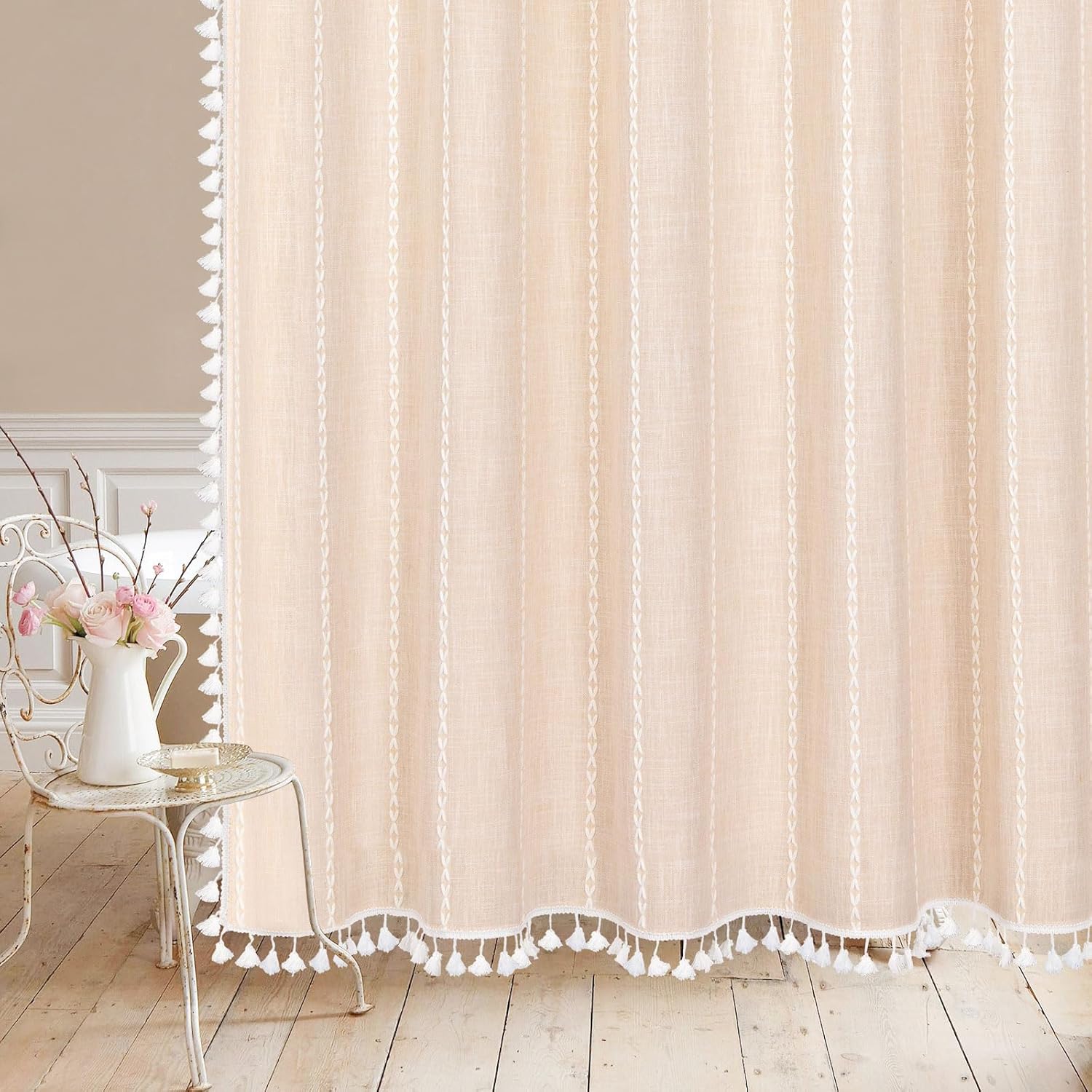 MitoVilla Beige Boho Long Shower Curtain 72 x 78, Cream Farmhouse 78 inch Long Polyester Linen Fabric Shower Curtains with Tassel for Chic Cottagecore French Country Bathroom Decor