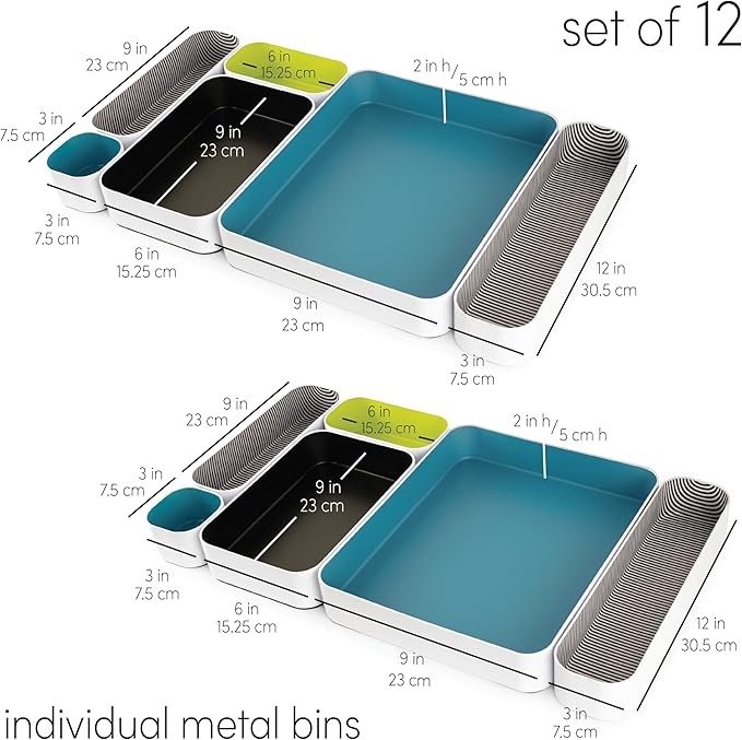 - INCLUDES: 12 metal trays each measuring 2 inches deep. Two trays measure 12 x 10 in., two measure 12 x 3 in., two measure 9 x 3 in., two measure 9 x 6 in., two measure 6 x 3 in., and two measure 3 x 3 in.