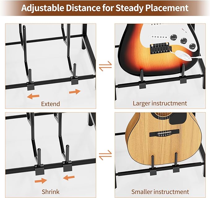- Sturdy and Stable:The record shelf is made of strong wooden boards,thicker irons and adjustable feet which is friendly touch,long-lasting,sturdy and secure,the holder arms are made of thick rubber cover and steel components,you can adjust the distance between the two holder arms easily,it won't wobble when placing guitars on the rack.