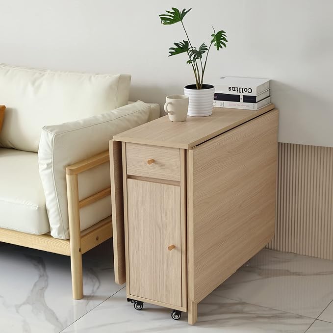 - 【Space-saving & Storage】Constructed with two drop-leaf and 2 storage cabinets, providing to minimize the drop leaf dining table size with enough storage space. Drawer on the top tier design to carry snacks, kitchenware, books, stationery and other special treasures perfectly. The storage shelf at the bottom could store up to 4 corresponding folding chairs. Notice : You have to buy the chairs separately in our shop.