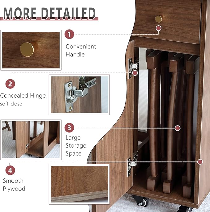- 【Space-saving & Storage】Constructed with two drop-leaf and 2 storage cabinets, providing to minimize the drop leaf table size with enough storage space. Drawer on the top tier design to carry snacks, kitchenware, books, stationery and other special treasures perfectly. The storage shelf at the bottom could store up to 4 corresponding folding chairs. Notice : You have to buy the chairs separately in our shop.