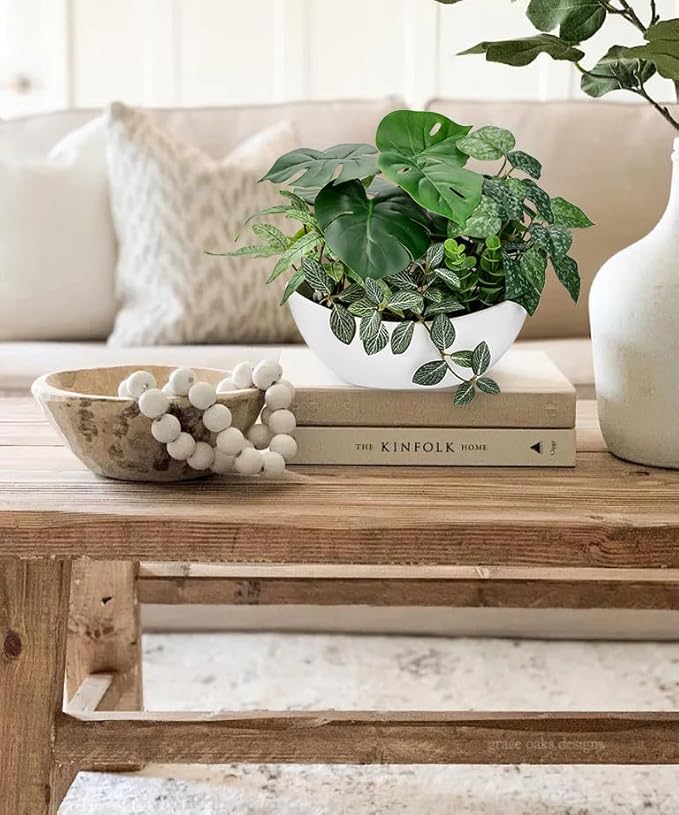 - [Fake Potted Plants] -Artificial monstera leaves, pothos satin, eucalyptus, fern and fittonia albivenis, 5 mixed small fake plants in a white plastic pot that is 9 inches long x 5 inches wide. The overall height of the fake plant decor and pot is 11.8 inches tall and overall length is 13 inches. This stunning arrangement showcases a variety of lifelike fake house plants.