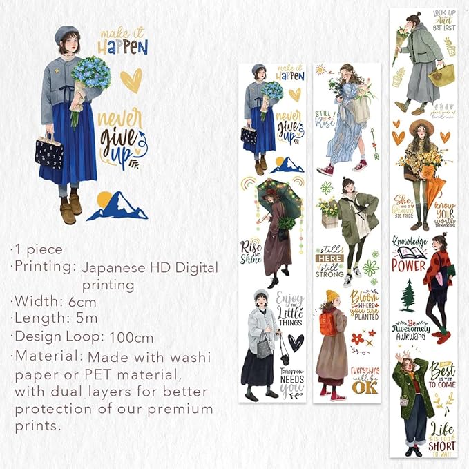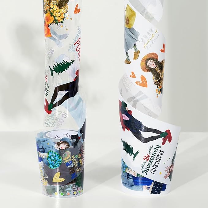 - Material and Dual Layers: The washi tapes are made of rice paper, which is semi-transparent. The tape comes indual lavers with backing to better protect our premium prints and allow for easier & cleaner cuts or tears. Youneed to peel off the backing, then can find the glue sides.