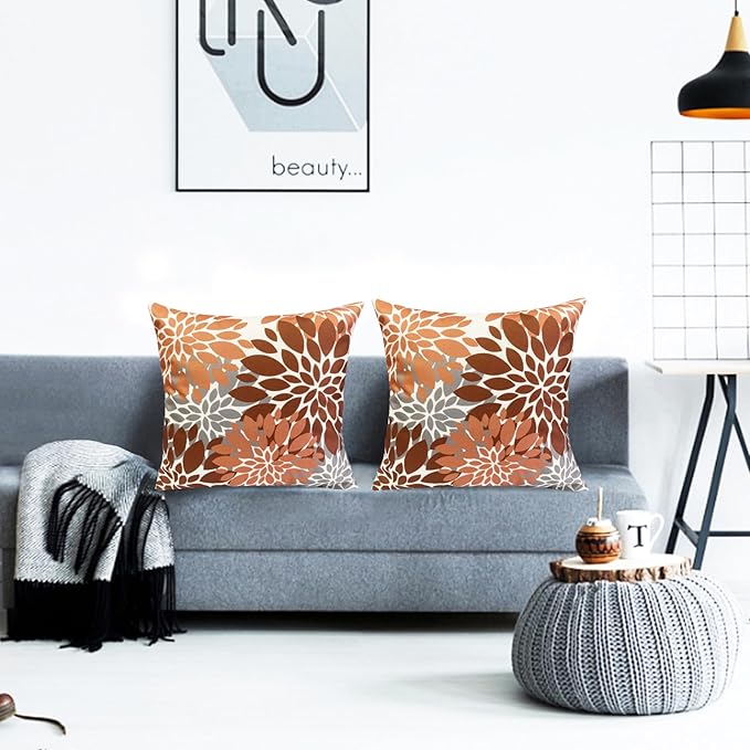 Decorative Throw Pillow Covers Set of 2 Brown Coffee Pillow Covers 18x18 Inch Couch Pillow Covers for Sofa Living Room Outdoor Throw Pillow Cover Linen Floral Flower Farmhouse Pillowcase