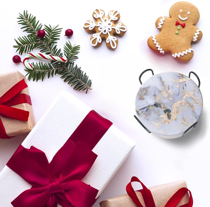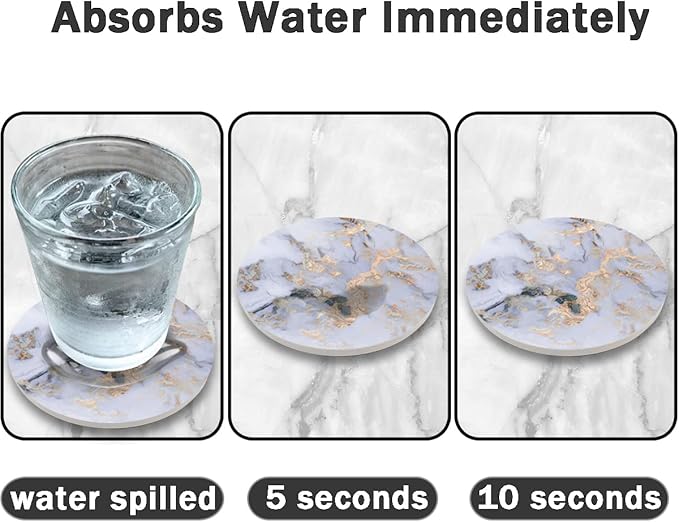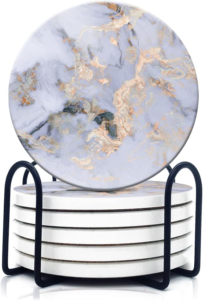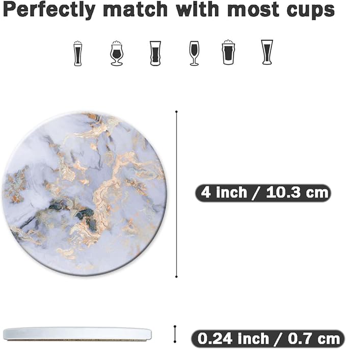 DOOKE Drink Coasters Set of 6, Round Absorbent Ceramic Stone Coasters with Cork Base, Funny Drink Coasters with Holder for Cold Drinks Wine Mugs and Cups, 4 Inch, Marble