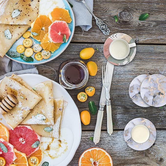 - CLASSICAL DECORATION : The cute coasters set with classic round pie-shaped, frosted edge design is a perfect decoration for all kinds occasions like coffee bar, living room, farmhouse, rustic kitchen, cool room, apartment decor. Front of the coaster adopts a simulation printing process, which has a slight stone touch, great as house warming presents for new home, coffee accessories, table decor, lake house decor.