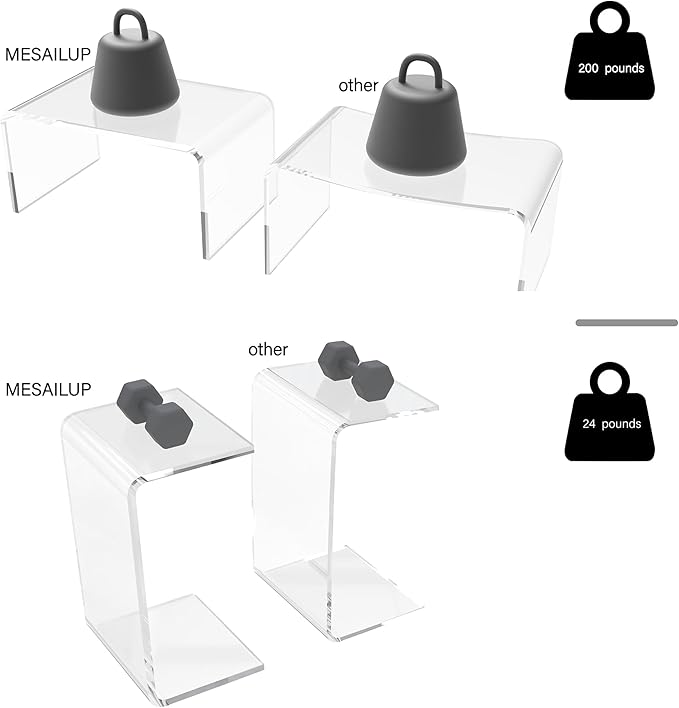 - 【Sturdy Construction】 The design uses thicker acrylic material to make the side table stronger. Overall Dimension: (L)24”x (W)15” x (H)12”. Thickness: 3/5". For horizontal table, it's maximum weight capacity is about 200 lbs. For vertical table, it supports weights up to 24 lbs. The acrylic side table is one solid piece and comes with perfect protective packaging, assembly is not required.
