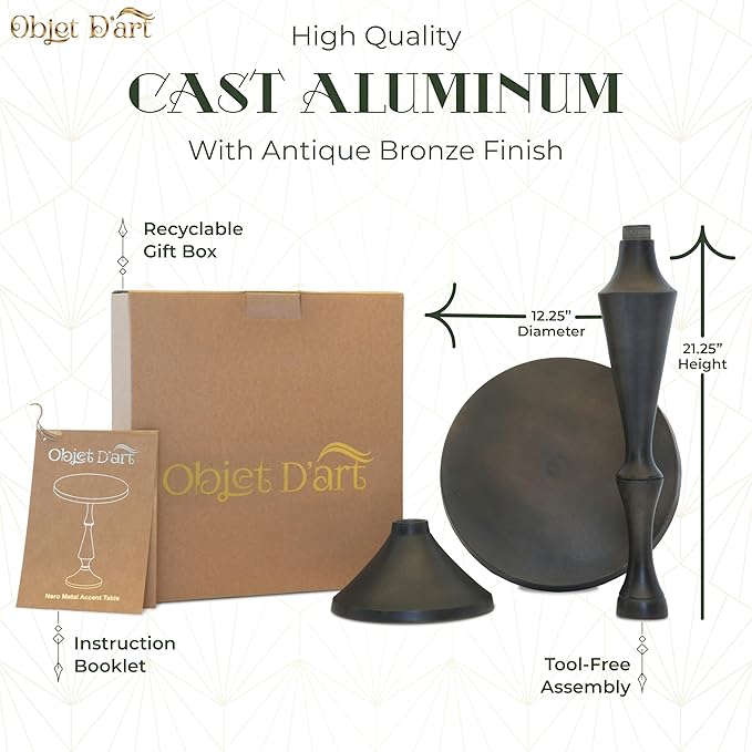 - UNIQUE HOME DECOR Made from high quality cast aluminum, our metallically accented side tables are handcrafted by skilled artisans. Along with its excellent resistance to corrosion, it has an antique black finish that's sure to set you and your home apart. This accent table is lovely and distinctive by design.