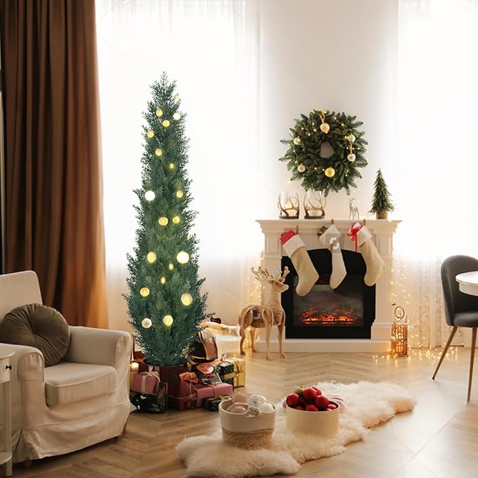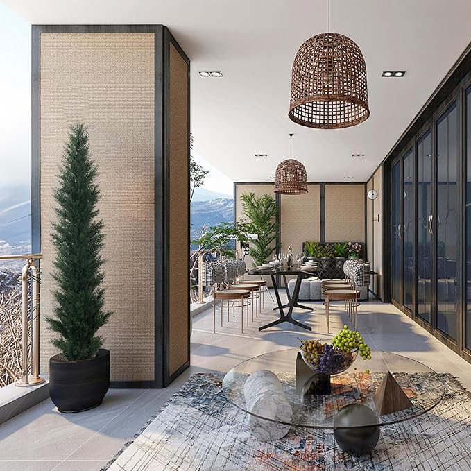 - 【 Durable Home Aesthetic Decor】Fake plant boxwood cedar tree with high-quality, UV resistant plastic leaves, carefully designed to withstand various outdoor weather conditions, including rain and sunlight. This extraordinary durability ensures that the tree maintains its vibrant color and overall appearance for a long period of time. In addition, the synthesized cypress tree consists of two parts, which can be easily assembled in 3 seconds, contributing to the home aesthetics of the tree.