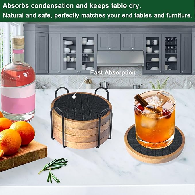 - 🍻Absorbent Coasters with Holder: Wood coasters with built-in thickened felt pads for stronger water absorption and heat insulation, capture liquids quickly were prevented any spills, keeping your tabletop clean and tidy, with no stains and water rings; extra large size easily accommodates cups of all sizes.