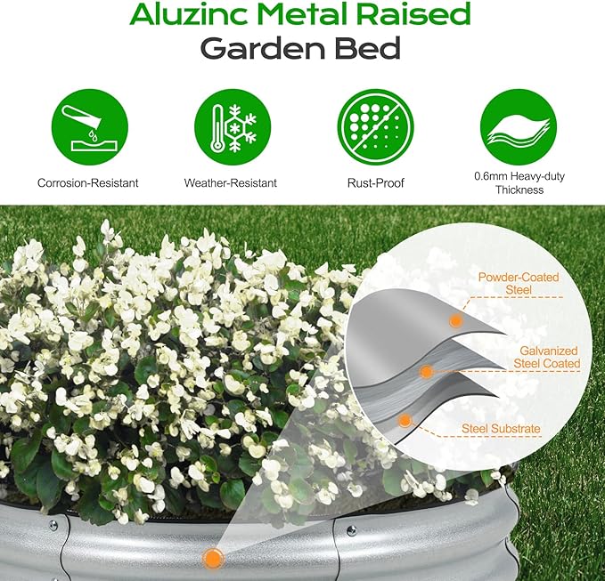 - Premium Material: This 9-inch tall circular raised garden bed is crafted from galvanized steel, featuring a zinc coating that protects the steel from rust by sacrificing itself, requiring minimal maintenance, offering a longer lifespan, and ideal for humid environments