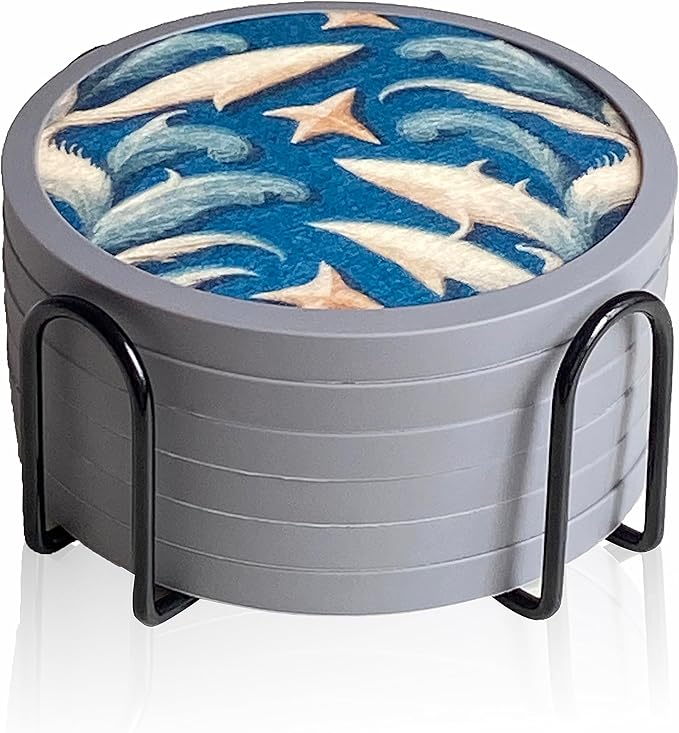 Absorbent Coasters for Drinks with Holder - 6packs, Silicone Coastes with Soft Felt Insert (4.3 inch Coasters with 4.5 inch Holder, Dual-Sided Ocean -Themed Patterns)