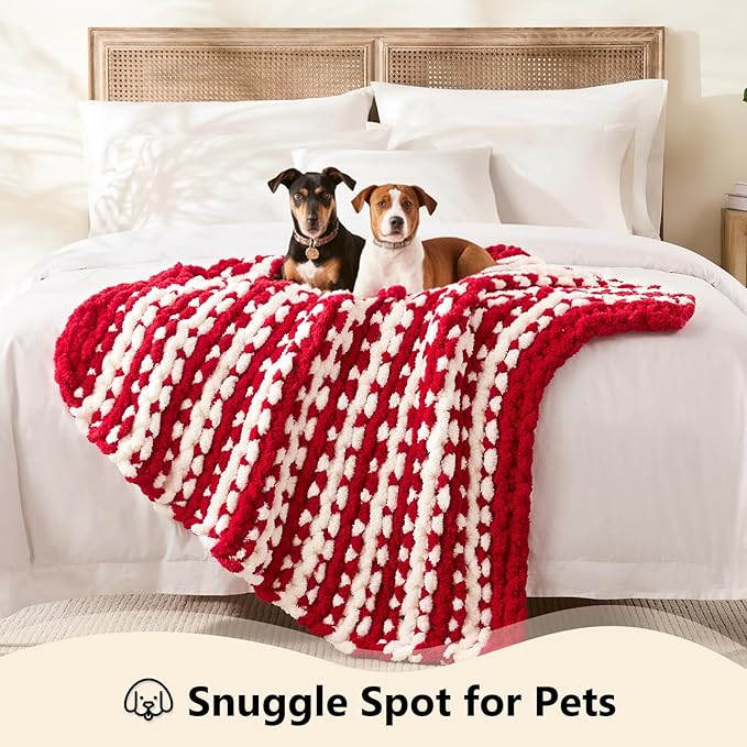 L'AGRATY Chunky Knit Blanket Throw - Soft Chunky Throw Blanket 30x40: 100% Hand Kintted Chenile Crochet Throw Blanket for Couch - Large Cable Knit Chunky Blanket for Home Decor(Red and White)