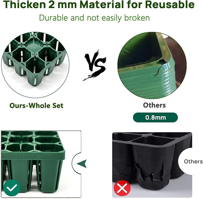 - Vego Garden seedling trays use 2mm PVC material, stronger and not easy to deform, can be reused many times. The thickened bottom edge material that can withstand the pressure, it would not lose soil or soak up too much water, and effectively cultivate seeds