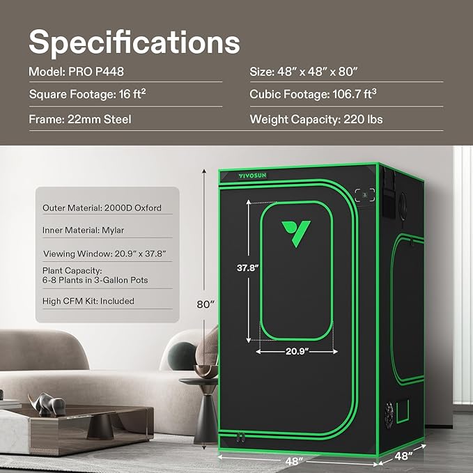 VIVOSUN P448 48"×48"×80" PRO Grow Tent, with Thick 1 inch Poles, Strengthened High Reflective Mylar Oxford Fabric, Extra Hanging Bars & High CFM Kit for Hydroponics Indoor Plant for AeroLight A200SE×2