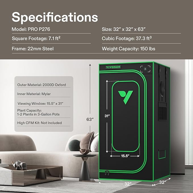 VIVOSUN P276 32"×32"×63" PRO Grow Tent, with Thick 1 inch Poles, Strengthened High Reflective Mylar Oxford Fabric & Extra Hanging Bars for Hydroponics Indoor Plant for AeroLight A150, No High CFM Kit