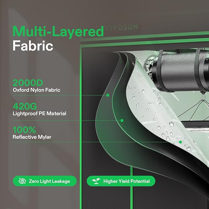 - Upgraded Lightproof Fabric: Durable 2000D Oxford canvas lined with plant-friendly PE and 100%-reflective Mylar; The three-layer thick fabric ensures zero light leaks, boosting the output efficiency of your setup; Zipper section is designed with black inner lining for enhanced light prevention