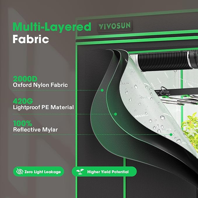 - Upgraded Lightproof Fabric: Durable 2000D Oxford canvas lined with plant-friendly PE and 100%-reflective Mylar; The three-layer thick fabric ensures zero light leaks, boosting the output efficiency of your setup; Zipper section is designed with black inner lining for enhanced light prevention