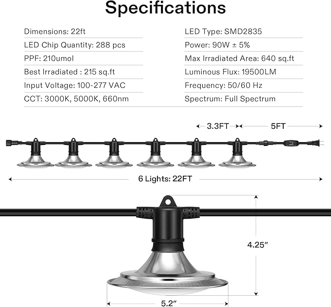 - Adjustable Light Quantity: The daisy chain design facilitates flexible connections, allowing you to link the lights end-to-end to accommodate various growing spaces and growth phases; A single switch can support up to 36 lights (6-light x 6 sets or 12-light x 3 sets), with a maximum of 540W under 110V, or up to 72 lights (6-light x 12 sets or 12-light x 6 sets) under 220V