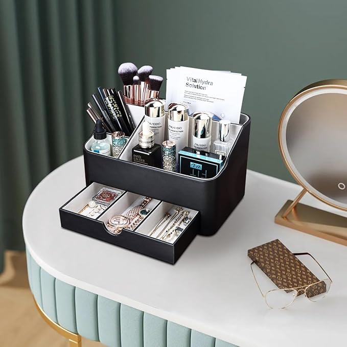 - ▶CONVENIENT DESK DRAWER ORGANIZER: Divided into 5 compartments and one small drawer, which have enough storage to allow for office supplies organization. Large capacity, multifunction help you arrange the desk accessories and stationaries clean and tidy.The best and strongest storage option for you. DIMENSIONS: 10.2"L x 6.6"W x 5.9"H(26 x 17 x 15cm)
