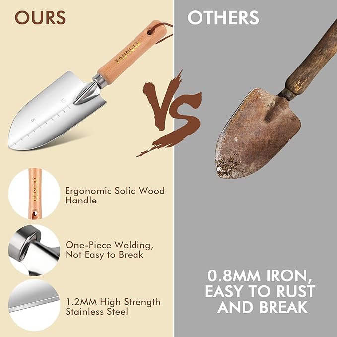 - Durable Stainless Steel - Heavy-duty stainless steel heads can withstand the toughest roots, rocks, and soil, sturdier than cast aluminum/coated/carbon steel, No need to worry about rusting and breaking during pruning, digging, weeding, etc. Mirror-polished process to make the tool get the minimal soil adhesion and easier cleaning.