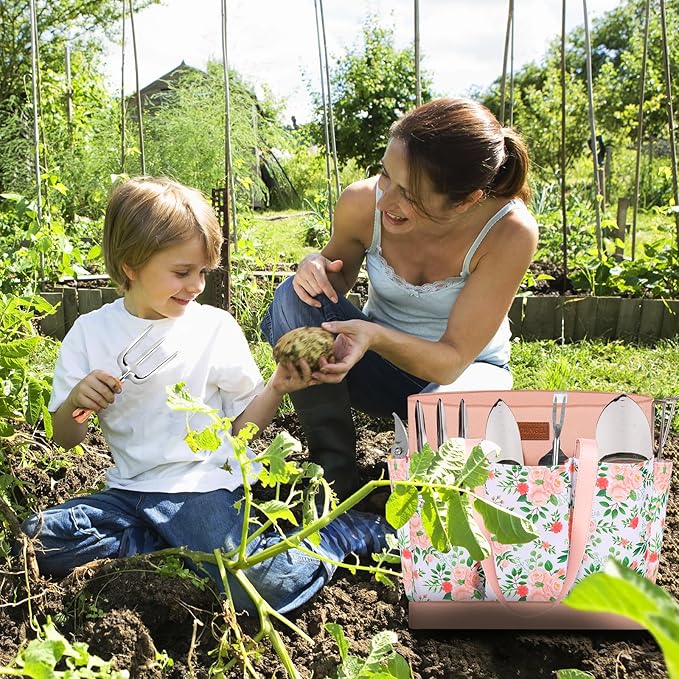 - Cover All You Need - 10 pieces garden tool kit has a handy tote bag, pruning shear, garden trowel, transplanter, weeder, hand fork, hand rake, kneeling pad, sprayer, garden gloves. All the gardening supplies are made of safe, non-toxic and harmless materials.