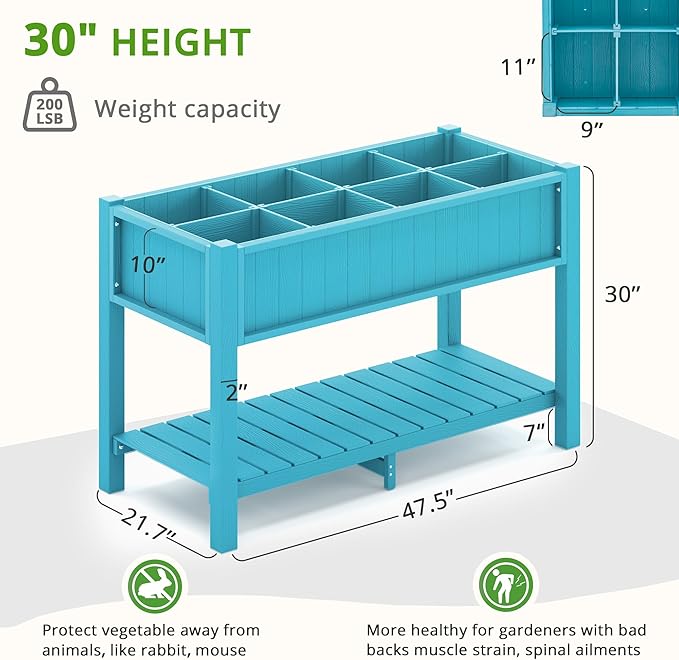 - Sturdy Frame Construction: 47.5"L x 21"W x 30"H, 10"depth; Features an enlarged shelf for additional storage of agricultural tools; Accommodates approximately 3.1 cubic feet of soil, with a weight capacity of around 200 LBS