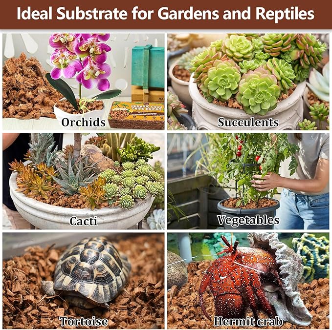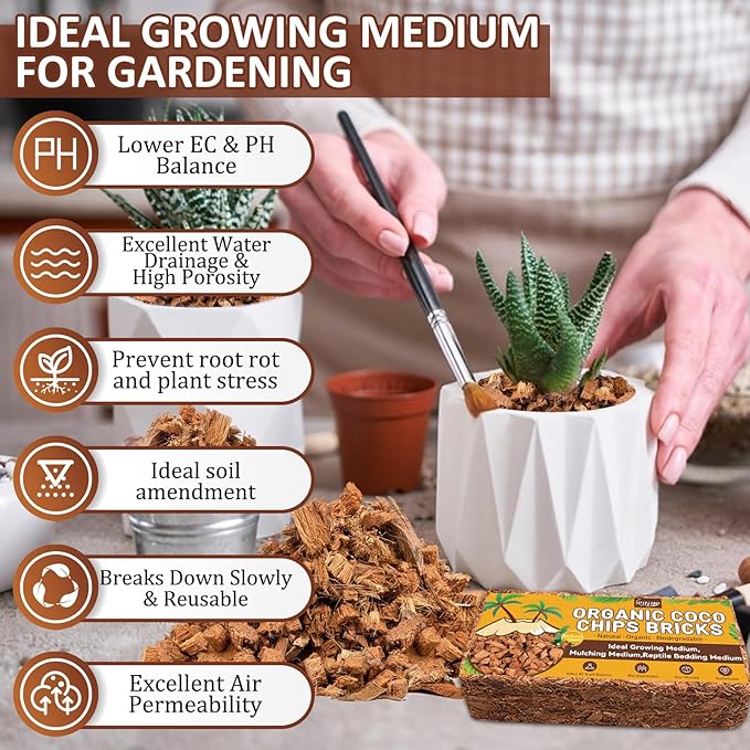 - Wide Application: Coco chips are suitable for garden planting, indoor flower pots, potting mixes, seed germination, raised garden beds, etc, promoting healthy root growth and rapidly expands the root system; Ideal for cacti, succulents, herbs, vegetables, microgreens and hoyas; It can also be used for reptile substrate and improve the living environment for pets