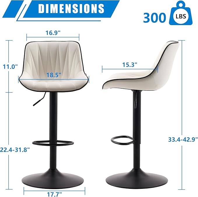 - |BAR STOOLS DIMENSION|: Total: 18" W x 20.86" D x (33.5-42.9)" H, Seat Depth: 15.35" , Seat Width: 18.5" , Seat Height: 22.44-31.9", Back Width: 16.9", Back Height: 11", Maximum load-bearing capacity: 300LBS