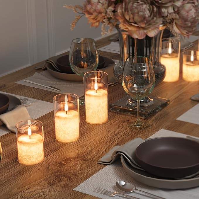 - 【White Flameless Candles】When these realistic flameless candles flickering, the light of the 3D wick is warm white, the bright candlelight passes through the clear glass, reflecting beautiful light and shadow, showing a cozy atmosphere, which is very suitable as a Mother's Day gift, birthday gift, and Valentine's gift. - Set of 3 with the size of 3'' in diameter, 4''/5''/6'' in tall.