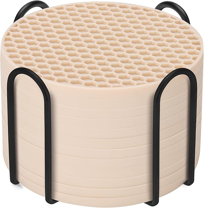 Silicone Coaster Set of 12 with Holder, Drinks Coasters, Beer & Coffee, Suitable for All Cups, Hot or Cold, Anti-Slip, Non-Stick, Anti-Overflow Tabletop Protection and Decor (12 Pcs, Tapioca)