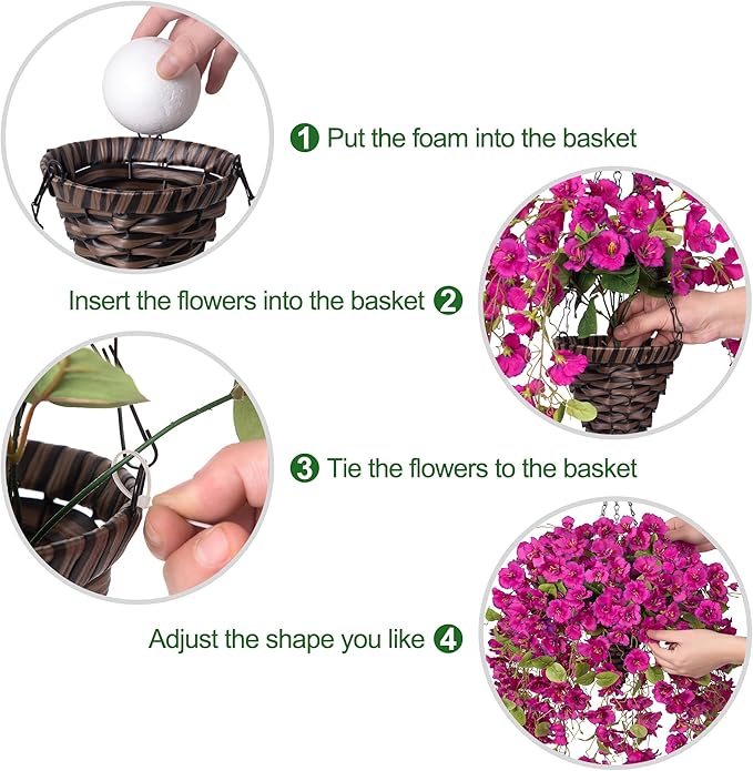 - SIMPLE ASSEMBLY: Artificial hanging outdoor plants needs 5 minutes to assemble. Simply place the silk flower branches to the basket and design the shape. Please refer to the pictures or video listed above if you need further instruction.