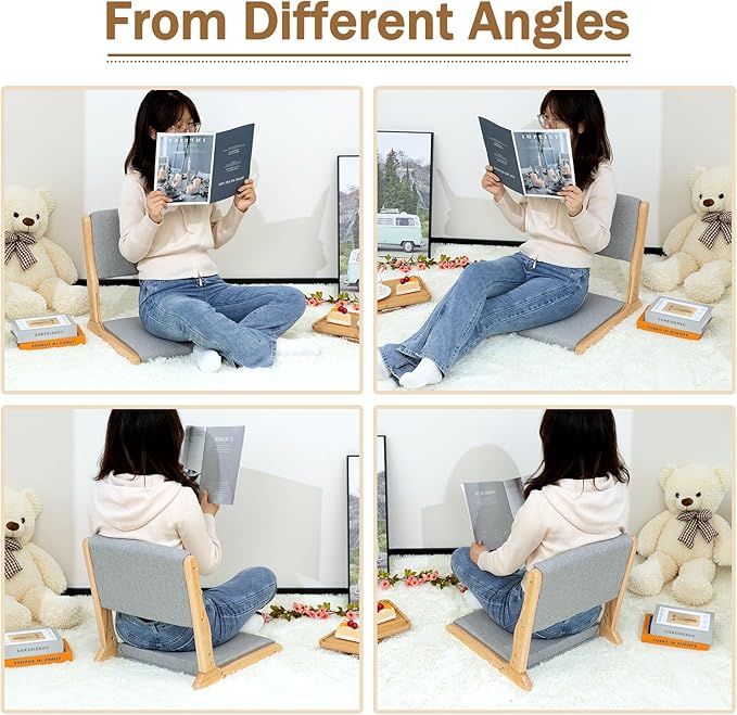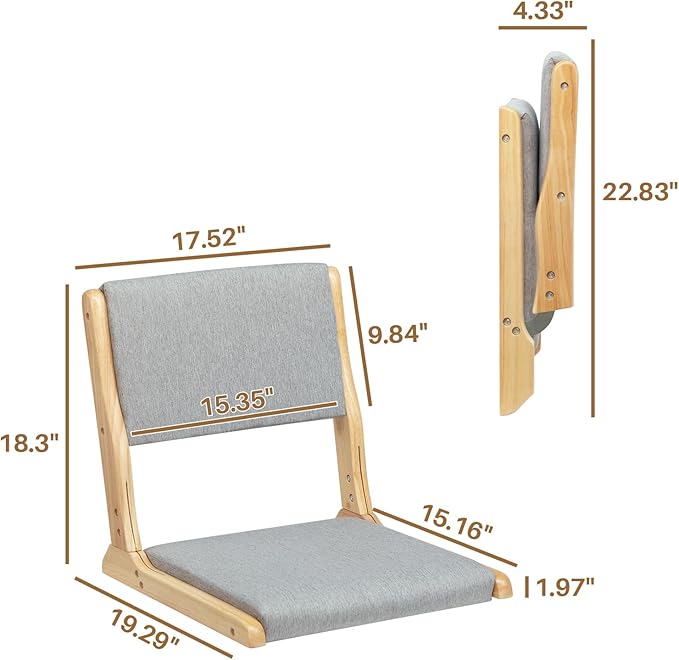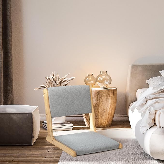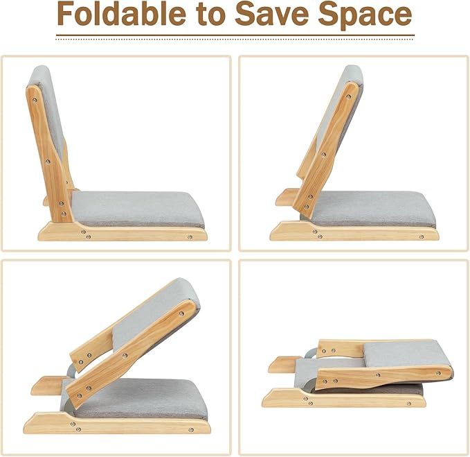 HollyHOME Foldable Japanese Style Floor Chair with Back Support, Wood Legless Tatami Chair with Cushion, Accent Meditation Seat for Bay Window, Living Room, Bedroom, Light Grey