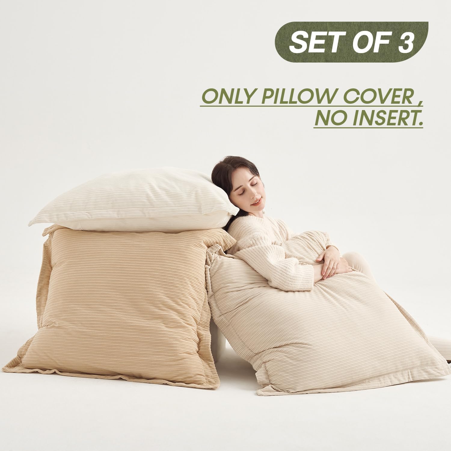 Set of 3 Oversized Throw Pillow Cover 28x28inch,Super Soft Striped Corduroy Neutral Earth Tones Pillow Cases for Bedroom,Living Room, Sofa Lounges,Girl Room(Camel, Beige & Pure White)